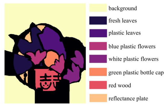 The active HSI data cube consists of 568 × 696 pixels and 174 spectral bands in the wavelength range of 400–1000 nm, whose false-color map has been shown in Figure 3b. The file of the active HSI data cube is given the suffix “active_HSI.mat”. Then, a hand-drawn label image of the active HSI data cube is delineated in details using Image Labeler app, shown in Figure 6. Similar to the method of ROIs selection, shadow areas and edge areas of objects (the black areas in Figure 6) are avoided, for the existence of degenerative or hybrid optical signatures from different materials. The label image file is given the suffix “active_HSI_label.mat”, comprising 568 × 696 pixels. The pixels number of each object are listed in Table 2. The labels are consistent with that of the spectral library, for the convenience of classification model training and testing. Among them, ‘Label 0’ refers to the black areas, which are not grouped into meaningful classes. The information about the dataset is summarized in Table 3.