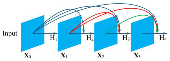 The concept of densely connection and DenseNet are proposed by Gao et al. [26]. In DenseNet, any hidden block has path to any previous block and back block, and dense connectivity combines features by concatenating them. As Figure 7 shows, assume that Xl is the output of the lth convolutional layer, and Hl(·) represents the complex nonlinear transformation operations including batch normalization, activation layers and convolutional layers for the lth convolution layer. The connected structure of DenseNet is formulated as: