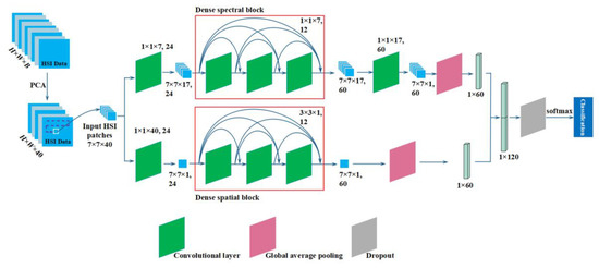 Recently, a few studies [28,29] show that the architecture of multi-dimensional CNNs is beneficial for the models to learn the highly discriminative features compared to those single-dimensional CNNs and thus gets better classification performance. Inspired by their findings, we create a hybrid DenseNet classification model containing a 1D spectral branch and a 2D spatial branch parallelly. Besides, in order to remove the spectral redundancy and reduce computational burden accordingly, Principle Component Analysis method (PCA) is applied over the original HSI data along the spectral dimension before classification. The architecture of the proposed model is shown in Figure 8.