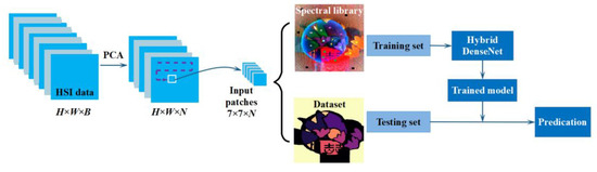 The hybrid DenseNet framework is shown in Figure 9. Deep-learning-based algorithms are data-driven, relying on labelled training samples. We follow the method mentioned in Section 4.3 to make the input patches. The training set is provided by the spectral library to train the hybrid DenseNet, while the testing set is provided by the dataset, as Figure 9 shows.