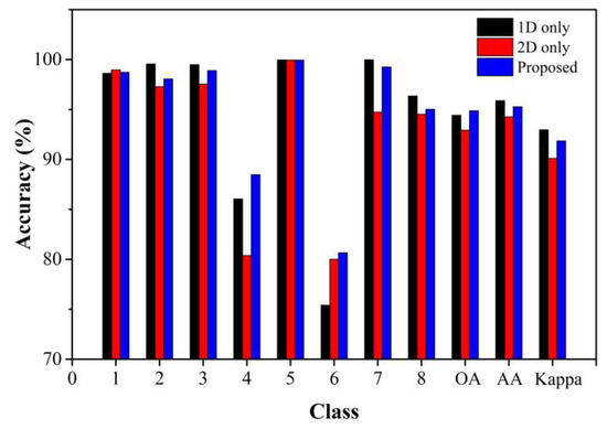 To validate the effectiveness of the proposed parallel double-branch structure, we do another two experiments, i.e., only with the 1D spectral branch and only with the 2D spatial branch. In these experiments, PCA is used to reduce the spectral bands from 174 to 40, and 100% training samples are used to train the models. The results are shown in Figure 11. From the figure, we can see that the model with only 2D spatial branch weakens the performance a lot, which ignores the spectral features. It implies that spectral features of active HSI are the key elements for classification. Adding the 1D spectral branch, the classification performance increases a lot as expected. In the other hand, for the model with 1D spectral branch only, it can achieve relatively good classification results for most objects, but for Class 6, its classification accuracy is very low. As it shows, considering spatial features is helpful to decline the misclassification of the Class 6, which means the spatial branch is indispensable to obtain more robust classification models for active HSI.
