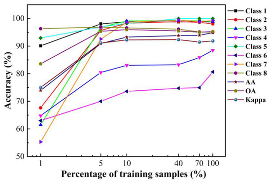 Deep-learning-based model is a data-driven algorithm that depends on large amounts of labelled samples. In this section, experiments are conducted to explore the performance of the proposed hybrid DenseNet with limited training samples. For the active HSI, we use 1%, 5%, 10%, 40%, 70% and 100% samples from the spectral library to form the training sets, respectively, and examine how the accuracy of each class, AA, OA and Kappa may be impacted.