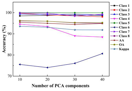 Figure 13 shows the effect of the number of PCA components to the classification results. For most classes, 10 components are enough to obtain a good accuracy; however, 40 components are need for Class 6 to achieve a satisfactory classification result. The experiment illustrates that there exists giant spectral redundancy in the active HIS dataset, and the spectral bands of the hyperspectral imager could be fewer.
