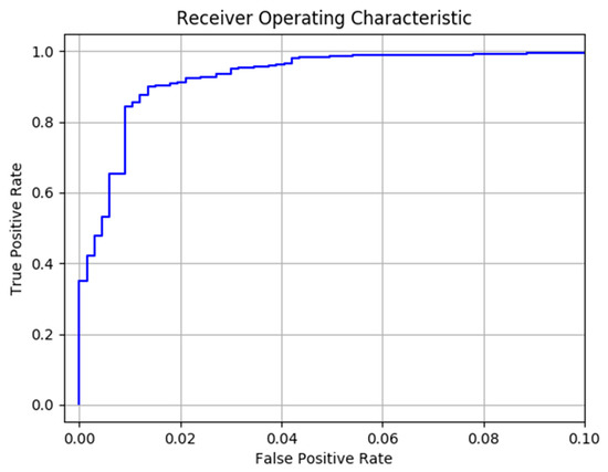 Recall = 0.95, precision = 0.98 or accuracy = 0.95, AUC = 0.99.