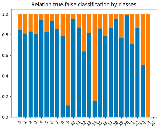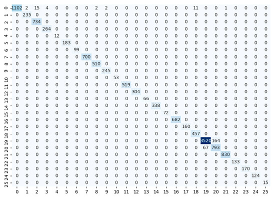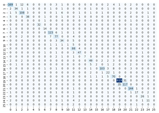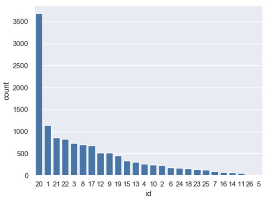 The data was divided into training and test sets in the ratio of 85:15, maintaining the proportions of the classes. As Figure 3 shows, the classes are very unbalanced. Thus, in the training test, for classes 26 and 5, 15 and 12 files are available. For class 20, 3684 files are available (see Figure 3).