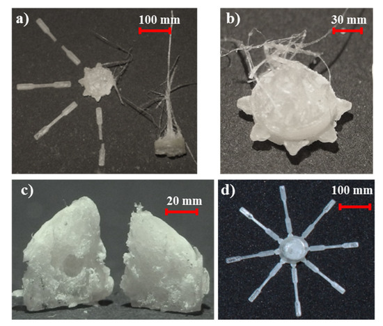 A preliminary study was done to determine the capability of the ultrasound equipment to mold mixtures of PLA and a water-soluble salt. Sodium carbonate (Na2CO3), sodium bicarbonate (NaHCO3), and sodium chloride (NaCl) were selected due to their low cost, biocompatibility, and wide use in salt leaching applications [44,45,46]. In a first attempt, PLA was mixed with a low percentage (e.g., 10 wt-%) of the selected salt. Both carbonates were decomposed during processing giving rise to carbon dioxide (Figure 2a,b) which means that samples could not be successfully molded. Even by varying amplitude, force, and time processing parameters, the PLA was not able to fill completely the mold and the specimens presented a lot of bubbles, especially for the bicarbonate sample (Figure 2c). Gas bubbles inside the molten polymer hindered the diffusion of molecular chains and led to a bad distribution and an imperfect molded specimen. Moreover, bubbles were responsible of cavitation effects that caused some polymer degradation as evidenced by the observed punctual coloration in some parts of the specimens.
