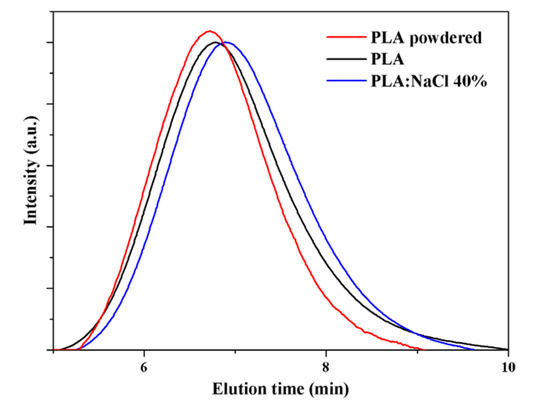 GPC chromatograms showed that the molecular weight of the neat PLA sample and that processed with 40 wt-% of salt were practically identical (Figure 3), although a small decrease on the weight average molecular weight (i.e., from 72,200 g/mol to 68,800 g/mol) was detected, suggesting the occurrence of a small degradation caused by ultrasound processing. This was slightly more significant than that detected in previous works [43], being consequently associated to the increased force that was necessary to process the salt rich specimen. In any case, the observed degradation (decrease on Mn less than 5%) was not significant to compromise final mechanical properties. Note also that the influence of the molecular weight decrease should be insignificant considering the porosity of the sample once the incorporated salt is removed.