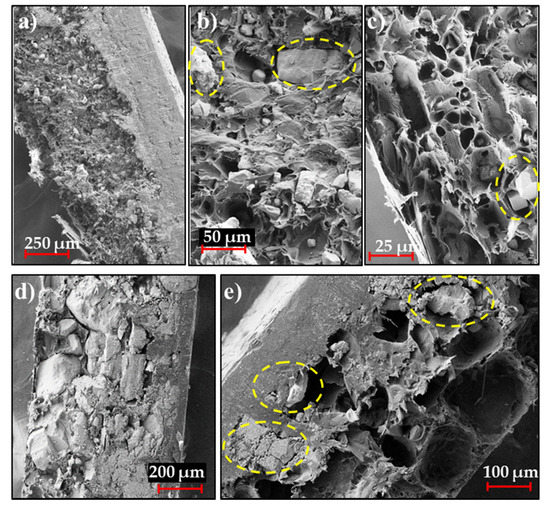SEM micrographs of the cross section of PLA specimens loaded with 40 wt-% of NaCl before ((a) for <45 μm and (d) for 100–250 μm) and after immersion in water ((b,c) for <45 μm and (e) for 100–250 μm). NaCl particles are marked with yellow ellipsoids.