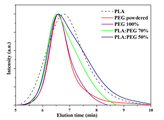 Gel permeation chromatography (GPC) profiles of powdered polyethylene glycol (PEG), micromolded PEG and PLA/PEG blends having 30 wt-% and 50 wt-% of PEG. The curve of a micromolded PLA specimen (dashed line) is also given for comparison purposes.