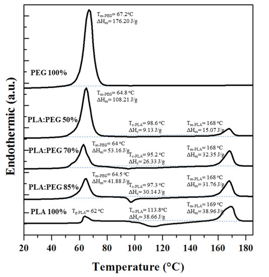 Figure 8 shows the calorimetric profiles of the first heating run of the neat PLA and PEG processed specimens, and micromolded blends with different PEG contents. The PEG profile was characterized by a sharp melting peak at 67 °C with a high melting enthalpy that pointed out the high crystallinity that could be attained (i.e., 89.6% considering the reported value for a 100% crystalline sample, 196.8 J/g [48]). PLA profile shows a glass transition temperature with a relaxation peak at 62 °C and a wide cold crystallization peak over a temperature range between 95 °C and 140 °C. The enthalpy difference between the melting and cold crystallization peaks was only 0.3 J/g, indicating that PLA was practically amorphous after the micromolding processing.
