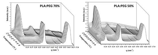 X-ray diffraction profiles of selected samples: PLA:PEG 70% and PLA:PEG 50% were recorded during the heating process and the corresponding graphs of 3D evolution are shown in the Figure 9. Peaks around 13.5, 14.8 (low intensity), 15.6 (low intensity), and 16.5 nm−1 were related to PEG, and clearly appeared in both cases indicating a high crystallization degree at room temperature. Peaks at 11.5, 13.3, and 15.5 (low intensity) were assigned to PLA. At room temperature PLA is mainly amorphous before cold crystallization in the PLA:PEG 70% sample whereas some degree of crystallization could be observed in the PLA:PEG 50% sample. Note that the main peak of PLA at 11.5 nm−1 is observed at room temperature, in agreement with DSC results. The presence of PEG during molding process increased the PLA crystallinity of the as-molded specimen. In both cases the increase in intensity of PLA peaks during the cold crystallization, from 100 °C, and the decrease of PEG peaks during melting process, around 70 °C, could be appreciated.