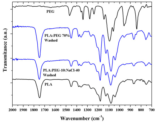 FTIR spectra of PLA:PEG 70% and PLA:PEG-10:NaCl-40 specimens after immersion in a water medium. For comparison purposes spectra of PLA and PEG micromolded specimens are also given.