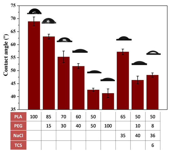 Hydrophilicity of the specimen surface is an important factor that favors the salt leaching process to get a porous scaffold. Contact angle measurements of representative ultrasound processed samples are shown in Figure 12.