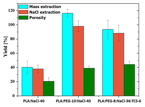 Extraction yields and porosity for PLA:NaCl-40, PLA:PEG-10:NaCl-40, and PLA:PEG-8:NaCl-36:TCS-6.