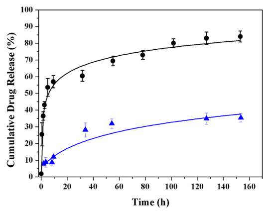 Release experiments were firstly carried out in a PBS medium. Less than 0.2% of the TCS loaded in the specimen was released (profile not shown) due to the poor solubility of TCS. Therefore, a PBS-ethanol mixture containing 70% ethanol was used as a release medium, the presence of ethanol increased the medium hydrophobicity and enhanced the TCS solubility. It has also been reported in previous works that this medium with an ethanol supplement could simulate the release of TCS in a physiological medium with serum supplementation [53,54].