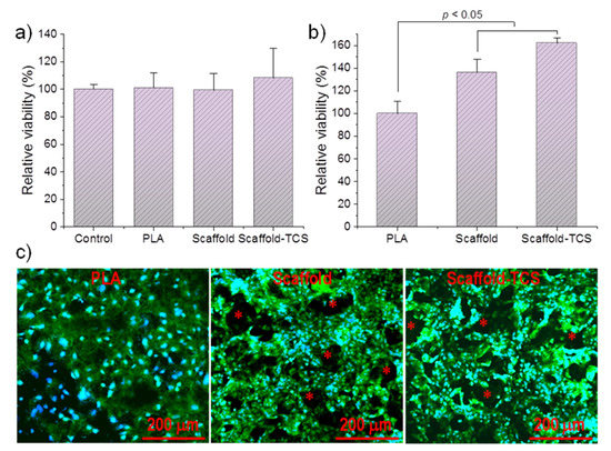 (a) Cell viability in the presence of the micro-molded specimens. Control corresponds to cell growth in the absence of any specimen. (b) Relative cell proliferation at 7 days after seeding on non-porous PLA, PLA scaffold and PLA scaffold loaded with 6 wt-% of TCS. (c) Fluorescence micrographs of the three indicated samples after the cell proliferation assay. The cells were stained for nuclei (DAPI, blue) and actin (phalloidin, green). Asterisks indicate scaffold porous.