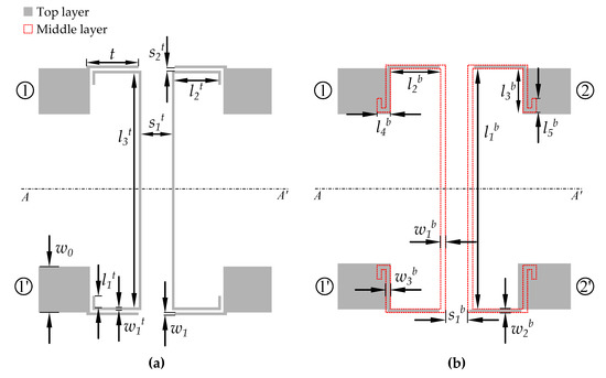 A 3-D view of the proposed multilayer structure for balanced dual-band operation is depicted in Figure 1. The two dimensional layout for each layer is depicted in Figure 2. The pattern etched on the top layer was used in [26] for the design of a single-band balanced BPF. It basically consists of a pair of open-loop resonators that are magnetically coupled (under DM operation). The middle layer also consists of a pair of open-loop resonators that are magnetically coupled when operating in DM. The difference between the two coupled resonant structures lies on the type of excitation and the values of the resonance frequencies. Thus, top layer resonators are excited via the gap capacitance associated with the gap width , while the middle structure is excited by means of the broadside capacitance created between the top feeding lines and the middle layer conducting strips. Figure 3 illustrates the overlapping section between layers which originates the broadside capacitance (indicated by the shaded region). By setting the value of , it is possible to control the excitation level of the middle-layer resonators, which is critical to implement the response of the differential passband created by this pair of coupled resonators. Figure 4 plots the simulated electromagnetic response (simulations have been carried out using ADS Momentum from Keysight, stationed at Santa Rosa, California, United States of America, USA) of the entire multilayer structure for both DM and CM excitations. Two differential passbands with good CM rejection can be appreciated in such figure, demonstrating the expected behavior of the proposed structure. The design process of the multilayer balanced dual-band bandpass filter that leads to such response is described in detail in the next subsections.