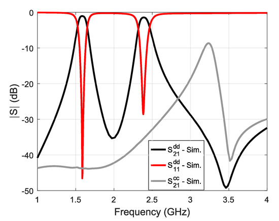 - Common-mode Rejection Ratio (CMRR). The average CMRR values of the filters in Table 1 for the first and second differential passbands is 37.95 dB and 32.55 dB, respectively. These values are very close to the ones achieved with the proposed design. The advantage of our proposal is that this high level of CMRR is inherent to the coupling scheme and no additional components have to be added to enhance the CM suppression (such as lumped inductors, capacitors or resistors, additional CM rejection stages, additional open-circuit stubs, etc.). The introduction of these elements usually entails disadvantages (increase in complexity and the need of reaching a trade-off to avoid the deterioration of other filter parameters).