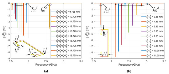 When designing a dual-band filter, it is very important that the two passbands can be independently tuned in terms of both center frequency and fractional bandwidth (FBW). In the case at hand, the first point that should be noted is that the middle layer of the structure introduces the lower passband, centered at 1.575 GHz, the L1 GPS signal frequency, while the top layer resonates at the first Wi-Fi band frequency, 2.45 GHz. This means that the upper frequency band should be allocated by setting the top layer parameters while lower frequency band must depend, exclusively, on the middle layer geometry. Let’s start by studying the resonance frequency of resonators in both layers. In Figure 5, the differential return loss, , have been represented when a single couple of top and middle resonators are weakly excited. The dips in the return loss correspond to the resonance frequencies of both resonators. Several parameters from each resonator were varied to show the dependence of those resonance frequencies with the resonator’s length. From the simulated results (Figure 5) the following conclusions can be inferred: