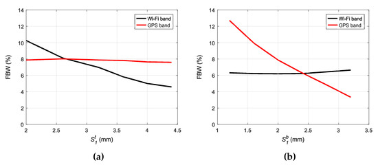 Fractional bandwidth is related to the coupling level between resonators. The closer the resonators are the larger the fractional bandwidth is. Referring to Figure 2, the relevant geometrical parameter that controls the coupling between resonators for the ones located on the top layer is , whereas is the responsible for the coupling level between resonators in the middle layer. To verify this, fractional bandwidth as a function of and are shown in Figure 7a,b, respectively. From Figure 7, it is clear that, as it happened with the center frequencies and the differential return loss, the fractional bandwidth of the two differential passbands are also independent from each other. This fact confers the designer full possibilities to adapt the design to other frequencies or other bandwidths that might be necessary for other requirements and specifications.