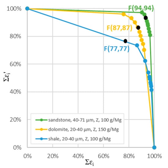 Fuerstenau’s beneficiation curves for sandstone, dolomite and shale copper ore types, Denver flotation machine (E—aqueous solution of ethyl sodium xanthate; Z—aqueous solution of isobutyl sodium xanthate).