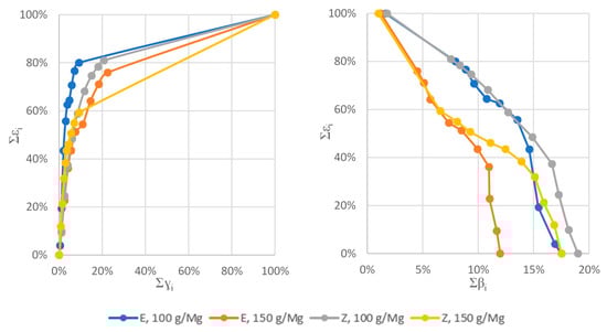 Mayer (left) and Halbich (right) curves for flotation of the dolomite copper ore type with particle size distribution of 0–25 µm by means of an aqueous solution of ethyl sodium xanthate (E) and isobutyl sodium xanthate (Z) in doses of 100 and 150 g/Mg in the Jameson cell.