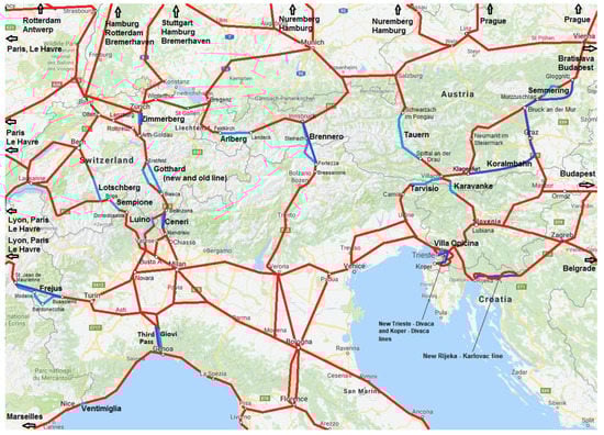 The minimum cost paths between the most important rail terminals of Italy, from one side, and the most important rail terminals of Central-Southern Europe and of Central-Eastern Europe, from the other side, have been calculated. Which Alpine pass is crossed by each minimum cost path has been determined. Minimum cost routes have been calculated by means of the Dijkstra algorithm. Two scenarios of study have been taken into account, namely: a ‘current scenario’, which involves only railway lines currently in operation, and a ‘project scenario’, which involves also railway lines under construction or planned. In order to do so, the railway network of a large part of Europe has been modelled. It comprises northern Italy, large part of France, Germany, Belgium, the Netherlands, Luxembourg, Austria, Switzerland, Czech Republic, western parts of Slovakia and Hungary, Slovenia, northern Croatia, and northern Serbia.