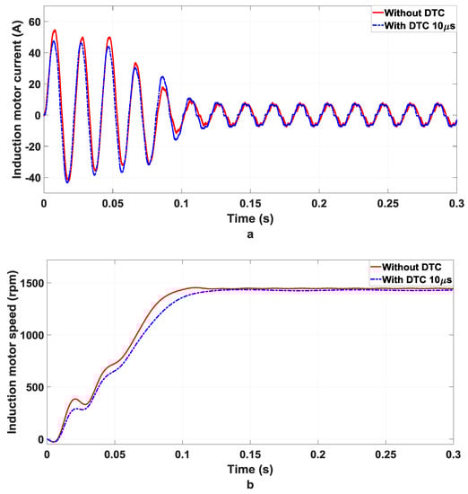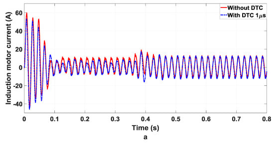 In case 2 while the dead time is changed from 10 to 1 micro-seconds, the DTC incorporation in the inverter circuit is shown to reduce the total harmonic distortions and also torque pulsation as shown in Figure 15a. In addition, DTC will lead to realistic changes in an induction motor performance, along with the smooth operation, low noise, minimal torque ripples, and increased operating efficiency due to the lower harmonic losses. Figure 15a–c demonstrate the increase in current waveform quality, induction motor speed, and also torque pulsation, collectively.