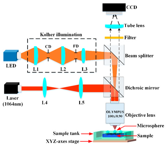 After selecting the PS and MF microsphere, in order to experimentally realize super-resolution imaging assisted by an optically trapped microsphere, we construct the experimental setup. The schematic of the optical system is shown in Figure 3, including the optical trapping system and imaging system with an upright objective lens. For the optical trapping part of the system, a continuous wave laser (wavelength of 1064 nm, 1.5 W, linear polarization) is used. Deionized water () is used to immerse PS microspheres (, D~10 μm, BaseLine ChromTech Centre, Tianjin, China) and MF microspheres (, D~10 μm, Huacortek Microtek Co., Ltd., Wuhan, China). For the illumination part, Kölher illumination is conducted, in which a broadband LED (central wavelength of 600 nm) with an adjustable intensity is utilized, and we can adjust the condenser diaphragm (CD) and the field diaphragm (FD) to improve the image quality [36]. The objective (100×, NA = 0.9) is provided by Olympus Corporation, which under our conditions, gives a lateral resolution of 306 nm based on the equation . A silicon nanostructure grating (SNG), consisting of 139 nm stripes with 139 nm separations is used as the sample which cannot be resolved by the objective. The imaging processing is conducted by a high-resolution CCD camera (acA2040, Basler). Firstly, we prepare the solution by diluting PS or MF spheres with deionized water in a proportion. Then, the sample is covered by a thin solution layer, and a few spheres are contained in this solution layer. The expanded laser beam is highly focused by the objective lens and then traps a sphere in the vicinity of its beam waist. The focused laser beam can be used to trap the sphere of interest. The optically trapped PS/MF microsphere is kept motionless and the position of the sample is adjusted by the 3-axis stage until the CCD captures magnified images of the measured surface in different positions. The optically trapped PS/MF microsphere is close enough to the sample and collects the sub-diffraction-limit frequencies of the sample. A short-pass filter (cut-off wavelength 800 nm) is used to eliminate the focused laser spot’s influence on imaging.