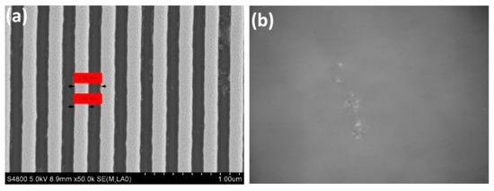 (a) The SEM image of the silicon nanostructure grating (SNG) with a period of 278 nm and a 139-nm line-width. (b) The imaging of the SNG without microspheres, from which we cannot visualize the grating structure due to the diffraction limit.