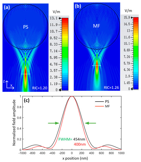 Numerical simulations of electric field distributions around a 10-μm sphere, with different refractive indices in water medium: (a) PS sphere, refractive index contrast (RIC) = 1.20, (b) MF sphere, RIC = 1.26. (c) Normalized intensity in the full width at half maximum (FWHM) plane for the PS and MF sphere. The white dotted line represents the location of the FWHM plane.