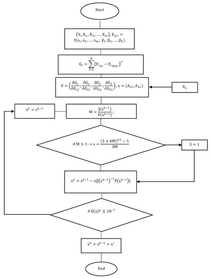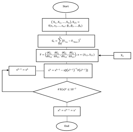 The modified Newton–Raphson algorithm with Broyden’s constraint was implemented to determine the adjustable parameters of Wilson’s equation for the binary system presented in this study. For this purpose, an algorithm was formulated to solve the NLS along with the nonlinear system generated from it. Figure 4 shows the proposed algorithm based on the described Broyden’s method. As shown in Figure 4, an initial value vector has to be set for solving the nonlinear system. Such consideration as a key-aspect to guarantee convergence in the solution and low computational time. Therefore, the values set for the initial vector are assigned depending on the phenomenon. Table 5 shows the results for simulations based on Broyden’s method.