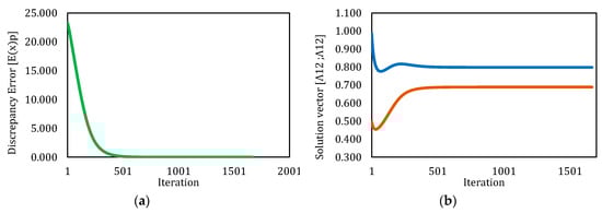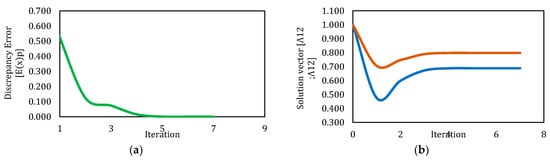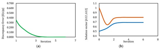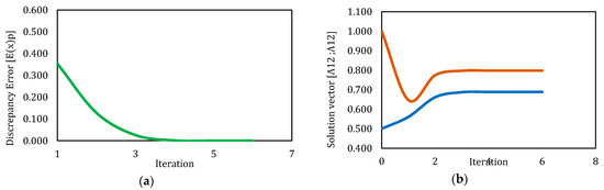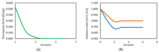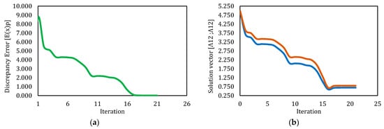 Behavior of discrepancy error and solution vector for Newton’s method-simulation 2. (a) Behavior of discrepancy error respect to iterations. (b) Behavior of values for solution vector respect to iterations.