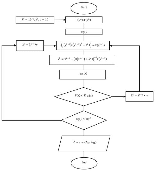 As developed by Broyden´s (and Newton´s) method, the Levenberg–Marquardt method (LMM) is formulated from Taylor’s series and is a combination of the gradient descendent rule and Newton’s method [24]. The LMM employs a parameter for controlling the step-size, which takes enormous values in the first iterations (equivalent with the gradient descent algorithm) and small values in the latest ones (equivalent with the Gauss–Newton method). Therefore, the LMM function generalizes the system of equations as follows in Equation (20):