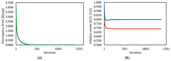 Behavior of discrepancy error and solution vector for Levenberg–Marquardt method-simulation 2. (a) Behavior of discrepancy error respect to iterations. (b) Behavior of values for solution vector respect to iterations.