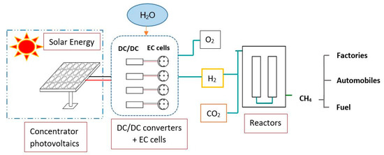 Figure 1 shows the fundamental StM concept of our system. As shown in Figure 1, sunlight was captured by highly efficient CPV modules and transformed into high-grade solar energy. The produced electrical energy was utilized in the water splitting system (which consisted of EC cells and DC/DC converters) to convert to H2 and oxygen. The proton exchange membrane (PEM) electrolysis method is currently attracting researchers’ attention as a result of its higher resilience, high functioning current densities, authentic gas generation, H2 manufacturing at a higher pressure, and compact structure. The process of mixing H2 and CO2 gases occurs while producing CH4 within the reactors. The energy conversion efficiency from solar to hydrogen and composition of produced methane can be unique depending upon the types of water splitting system, reactors, and catalysts.