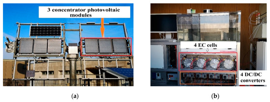 (a) View of the concentrator photovoltaics (CPV) outdoor configuration at the University of Miyazaki, Japan, and (b) view of 4 sets of DC/DC converters and electrochemical (EC) cells set up used for hydrogenation.
