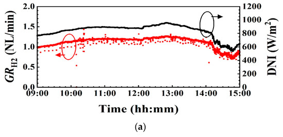 Figure 5a shows GRH2 compared to DNI. Figure 5b shows the internal temperatures of the reactors compared to the concentration of CH4. A CO2 conversion efficiency of 97.6% was maintained for approximately 4 h. Although the operating temperature was set to 260 °C, the inner temperature of reactor 1 increased over 260 °C. The cooling system was not utilized in this system. Therefore, the heat was released during the reaction. However, the temperature of reactor 2 was stable at the operating temperature (260 °C). This was because of the low reaction rates in reactor 2. Most of the reaction was performed in reactor 1 and thus the temperature of reactor 1 was higher than that of reactor 2 as a result. The average GRH2 was 1.19 NL/min in the experimental period (10:00 a.m. to 2:00 p.m.). CO2 gas applied to the methanation system, which corresponds to one-quarter times the fed H2 gas, was 0.30 NL/min. The total mixture gas, which fed to the system, was 1.48 NL/min. Due to the changing DNI during the experimental period, the generated H2 gas changed. Therefore, mixture gas fed to the system and space velocity also changed. The degradation of catalysis could not be seen in the experimental period.