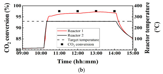 The performance of methanation at temperatures ranging from 240 to 300 °C was analyzed in this study. The temperature of the gases generated from the catalytic reaction were measured. Figure 4a indicates the quantity of CO2 converted to CH4 from both reactors. The CO2 conversion to CH4 was calculated as shown in Equation (1):