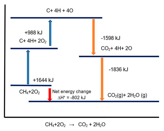 The stored chemical energy of CH4 should be considered in StM conversions because it is directly used in power generation via combustion. Figure 7 shows a schematic illustration of combustion energy of CH4. CH4 has a combustion energy of −802 kJ/mol. Solar to methane efficiency (ηStM) is defined as shown in Equation (3):