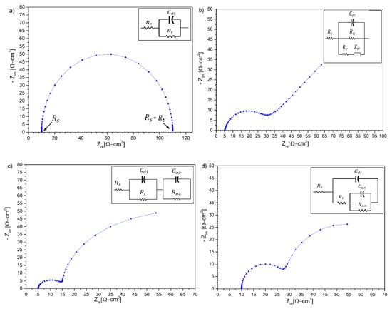 Nyquist plots and the equivalent circuits representing the corrosion of metals in molten salts. (a) Representation of a non-active metal; (b) active metals forming a porous scale; (c) active metals forming a protective scale; (d) active metals suffering from localized corrosion. (Adapted from [21]).