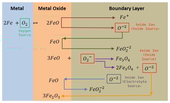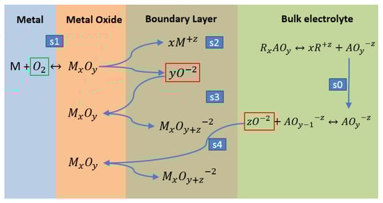 The abundant oxide ion , found in the ion cloud formed by the dissolution of the passive layer, reacts again with the oxides of the passive layer, forming a species of the form . This stage (s3) is also supposed to be fast, like (s2). Finally, stage 4 (s4) is the slowest and is controlled by the diffusion of the oxide ion , formed by the dissociation of the oxyanionic salts () in the electrolyte. The mass transfer is affected by the ion cloud in contact with the metal oxide.
