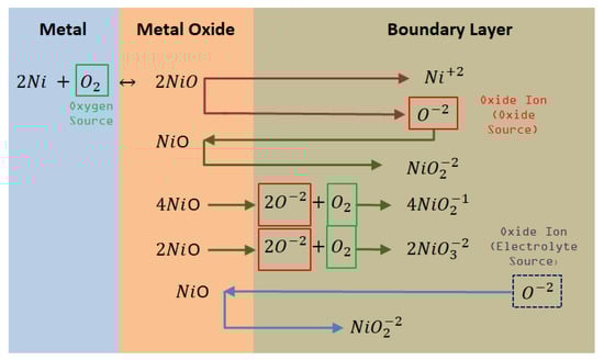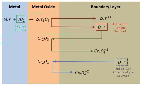 Figure 3, Figure 4 and Figure 5 show the proposed corrosion mechanisms for Fe, Cr, and Ni metallic elements during the corrosion process, and are related to Figure 2. Iron metal reacts with O2 generating oxidized products on the metal surface, shown in Equations (3), (5), and (6), generating the oxide metal layer. The dissolution of the metal oxide can occur via the acid and basic pathways. When the ion activity is low in the melt, the metal oxide will dissociate, resulting in oxides ions and potentially soluble metal ions (Equation (4)). Meanwhile, increase of ions in the boundary layer create metal oxide anions soluble in the salt generating oxide ion in contact with the metal surface, thus, these processes could be identified by a change in electrochemical impedance as a function of time.