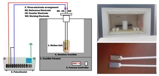 Schematic of the electrochemical system. 1: Crucible furnace; 2: three-electrode arrangement (Re: reference electrode, CE: counter electrode, WE: working electrode or sample); 3: molten salt; 4: alumina crucible; 5: furnace controller; 6: potensiostat (left); predisposition of the high temperature furnace and welded and cemented electrodes in alumina tubes (right).