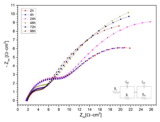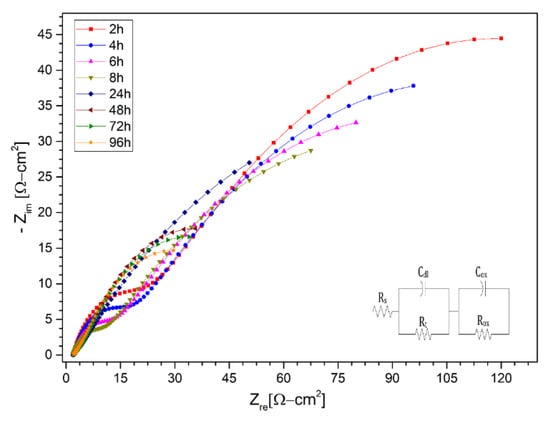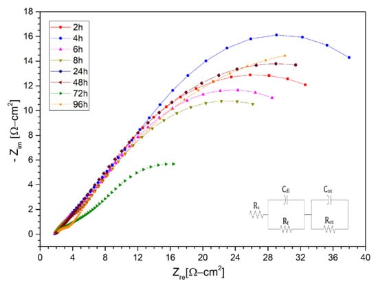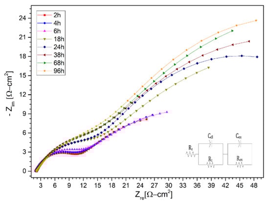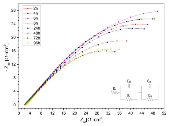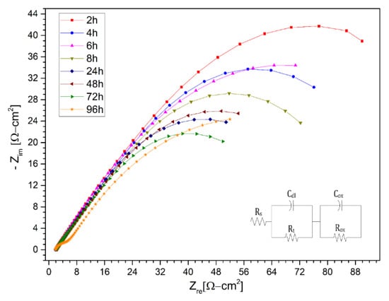 Nysquist diagram of stainless steel 304 layer in (LiNaK)NO3 (ternary salt with lithium content). at 2 h, 4 h, 6 h, 8 h, 24 h, 48 h, 72 h and 96 h at 550 °C.