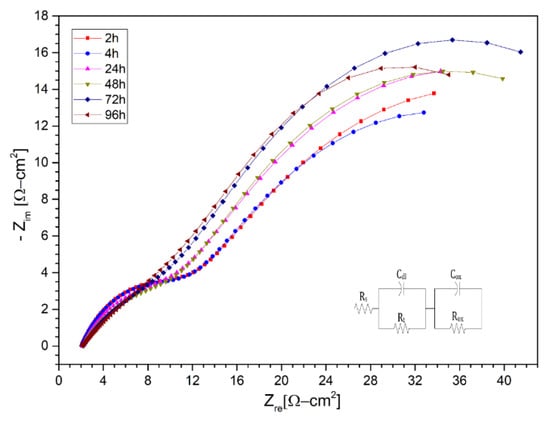 Subsequently, the Nyquist diagrams for the ternary salt with lithium content (LiNaK)NO3 are shown in Figure 10, Figure 11 and Figure 12 for the AISI 304 and AISI 430 stainless steels, as well as for the nickel-based alloy HR-224, respectively. The measurements were made after 2, 4, 6, 8, 24, 48, 72, and 96 h of exposure. The impedance spectra of the corrosion monitoring of AISI 304 stainless steel differs from both AISI 430 stainless steel and nickel-based alloy HR-224. AISI 304 stainless steel shows similar behavior up to 48 h of measurement in contrast to 72 and 96 h, where a small increase of the high frequency semi-circle can be seen due to the load transfer reaction at the metal/molten interface. In the cases of stainless steel AISI 430 and the nickel-based alloy HR-224, they show a consistent formation in their high and low frequency semi-circles, indicating the charge transfer reaction and the corrosion resistance of the protective layer respectively. The difference in the behavior of the impedance spectra in both the solar salt and the ternary mixture may be due to the LiNO3 content; as it is more basic than KNO3 and NaNO3, it has a high activity in the ternary mixture (KLiNa)NO3. According to Cheng et al. [10], the formation of various compound oxides is evidenced by the effect of lithium diffusion in the metal, which generates a series of surface layers apart from the protective layer at the metal/molten interface. Thus, the impedance spectra of these materials show a similar fit to a non-active metal model of the protective layer. This can be explained by the sufficiently high chemical stability in the molten salt systems, in the case of HR-224 and AISI430 materials. The results obtained in terms of the equivalent electrical circuits obtained from the spectra shown in (LiNaK)NO3, are represented in the Table 6, Table 7 and Table 8.