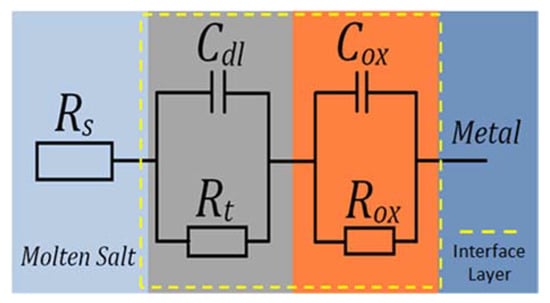 The relationship between the corrosion mechanisms from both chemical and electrochemical models suggests that the general situation of how ions interact within the metal-melted system is primarily governed by oxidation, which in this case is the oxide ion . Therefore, the resistance (impedance) of the system is directly related to the different layers that are formed in the time of exposure of the samples. Therefore, the charge transfer in the system between the metals and the electrolyte makes the corrosion process slower/fast, leading to the change in impedance. For this reason, the equivalent circuit for the formation of the protective layer is shown in Figure 13, and it should be conceptualized based on the reaction mechanisms already represented in this article.