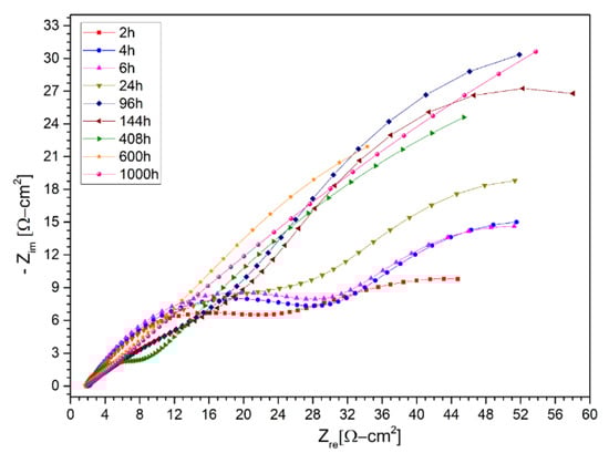 Nysquist diagram of VM12 layer in LiNaKNO3 (ternary salt with lithium content) of 1000 h at 2 h, 4 h, 6 h, 24 h, 96 h, 144 h, 408 h, 600 h, and 1000 h at 550 °C.