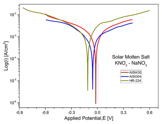 Polarization curves of stainless steel AISI 304, AISI 430, and nickel-based alloy HR-224 in KNaNO3 (solar salt) at 550 °C and 100 h of exposure.
