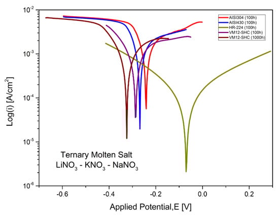 Alternatively, electrochemical polarization tests allow us to obtain the corrosion rates in a fast way, in which the results obtained for the materials AISI 304, AISI 430, nickel-based alloy HR-224, and ferritic steel VM12 in both cases of salt mixture are shown in Table 11 and the Tafel curves shown in Figure 16 and Figure 17. A comparison between the corrosion rates of the two study salts can be seen, taking into account the open circuit potential of the electrochemical system, the corrosion potential, and the current density.